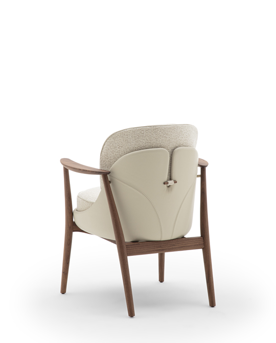 Crafted with a solid Canaletta walnut frame, the chair is grounded in warmth and material richness, while its leather-upholstered outer shell embraces removable fabric covers for both seat and backrest—allowing for ease of maintenance and a high degree of personalization. Beneath its refined surface, differentiated-density padding ensures consistent comfort, complemented by a polyurethane foam backrest designed for ergonomic support.