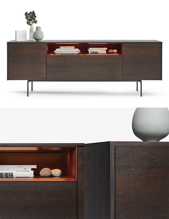 This Modern sideboard highlights a thoughtful dialogue of materials. Eucalyptus wood surfaces are paired with an open Azuki-lacquered module, softly illuminated to highlight objects on display. Raised on black Bridge feet, the composition feels light yet grounded—designed for modern homes where function and storytelling coexist.