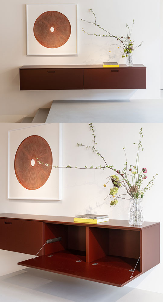 Gallery Low Cupboard is defined by contrast. The warmth of eucalyptus wood on the outside meets an Azuki-lacquered interior within—an unexpected detail revealed only when opened.
