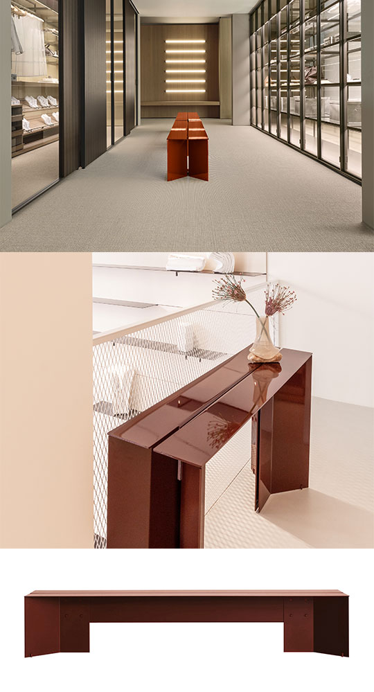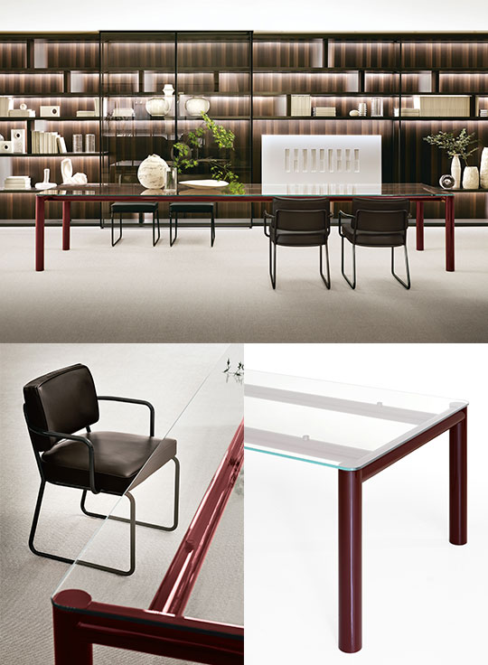 Ventiquattro feels light at first glance. Its transparent glass top reveals the Azuki-finished steel structure beneath—clean, precise, and intentionally exposed.