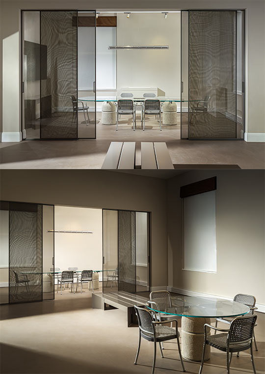 The small hall, conceived for temporary exhibitions, features two bronze Origata benches positioned among meeting tables. Defined by essential geometries, they invite pause and reflection, subtly reinforcing the encounter between art and institutional exchange.