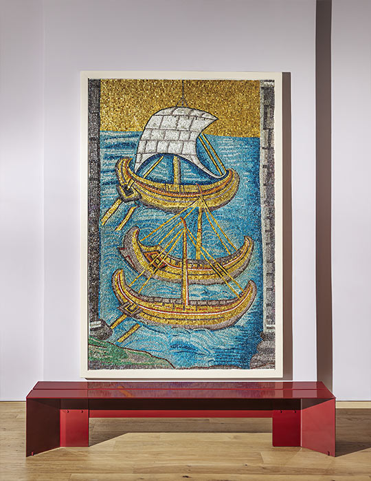 In the secretarial area of the Ambassador and the Minister, an Origata bench in vivid China red stands before a glass-paste replica of the Byzantine mosaic from the Basilica of Sant’Apollinare, crafted by the Mosaicists Group of the Ravenna Academy of Fine Arts. Through contrast and material depth, the setting articulates a shared commitment to craftsmanship, heritage, and enduring design culture.