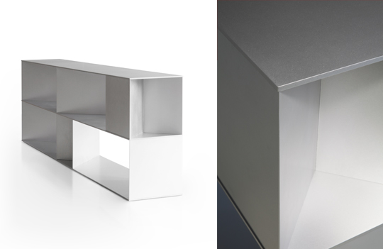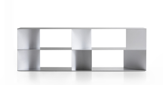 A focal point of the presentation is the Ryo bookcase by Nao Tamura. Conceived as a luminous “fifth element” within the room, Ryo is defined by elongated horizontal shelves supported by adjustable triangular folds in aluminum—each formed from a single sheet.