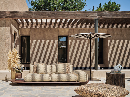 Step into Glowing Outdoors, where Roberto Cavalli Home Interiors transforms outdoor living into an experience of style, comfort, and emotion. Inspired by fashion, design, and exotic influences, the new collection turns terraces and gardens into inviting retreats—spaces that feel alive, luxurious, and effortlessly glamorous.