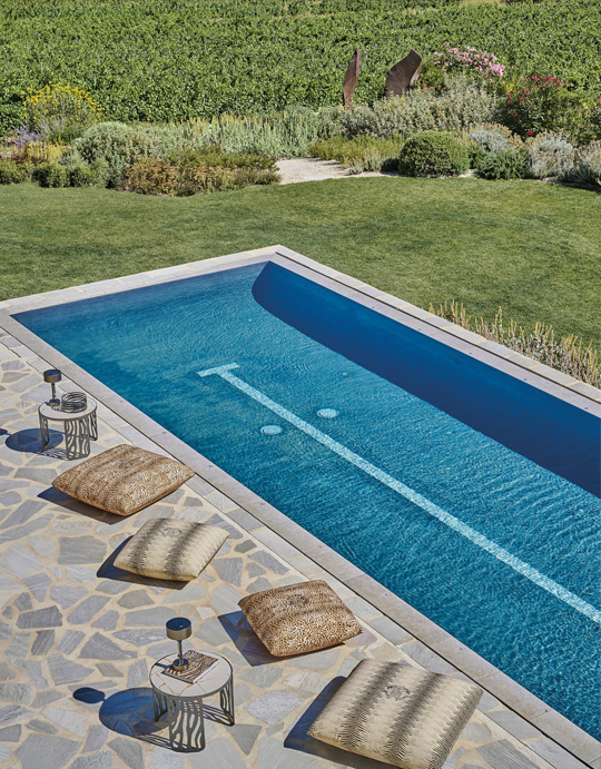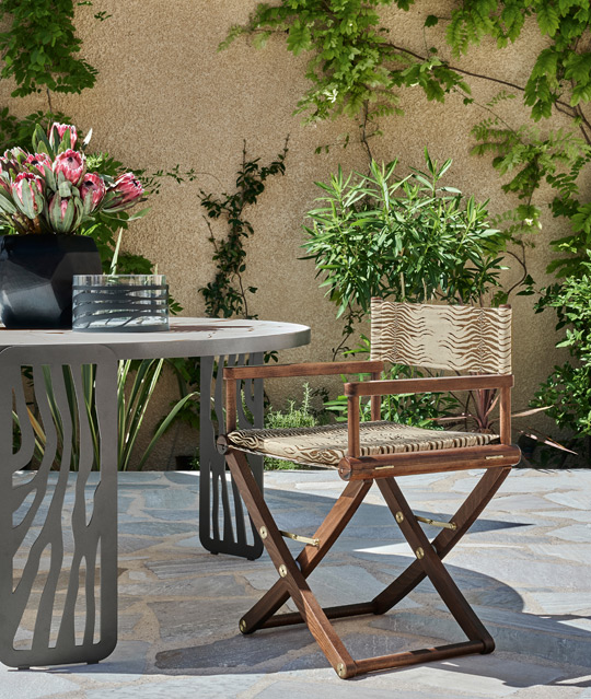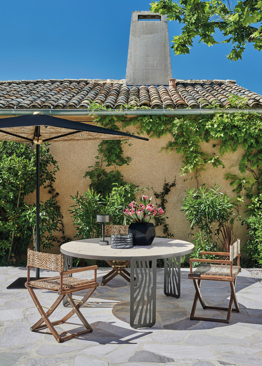 Natural and African inspirations shape the sculptural Kalahari dining and low tables, their iron bases echoing animal motifs and desert dunes, topped with porcelain gres for a refined, functional touch. Completing the scene, the Diani pouf invites relaxation, adding warmth and a cozy layer to any outdoor setup.