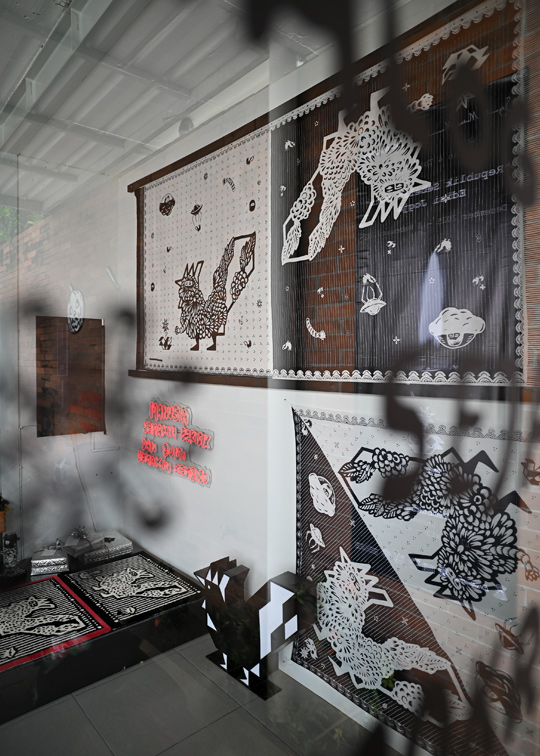 Masih di lantai yang sama, enam look ikonis dari koleksi Republik Sebelah Mata ditampilkan dalam ruang dengan proyeksi visual dinamis. Permainan cahaya, bayangan, dan ritme gerak menghadirkan suasana imersif yang mencerminkan pendekatan khas EKO NUGROHO—ceria di permukaan, reflektif di baliknya.