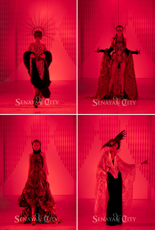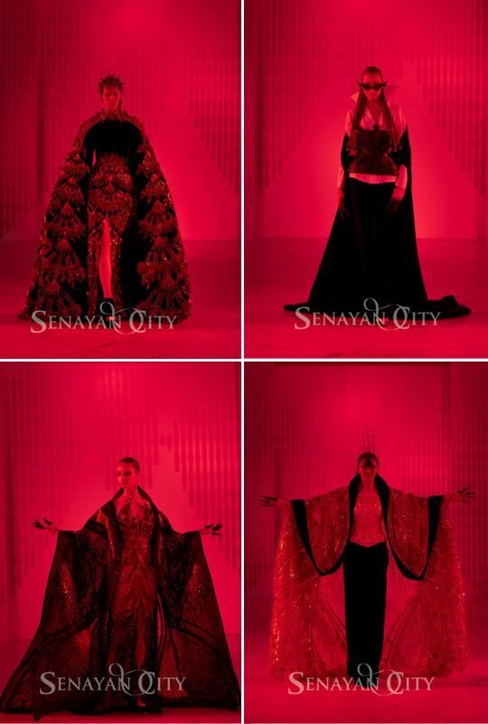 DOMINA bukan hanya koleksi, tapi kisah yang hidup di atas panggung. Sebelas tampilan yang ia hadirkan menjadi perayaan akan keberanian berekspresi—rangkaian gaun unik dan dramatis yang disulam dengan detail bordir halus dan payet berkilau. Diselimuti cahaya merah yang memberi sentuhan magis, suasana panggung berubah menjadi seperti adegan dari dongeng gelap yang penuh pesona.