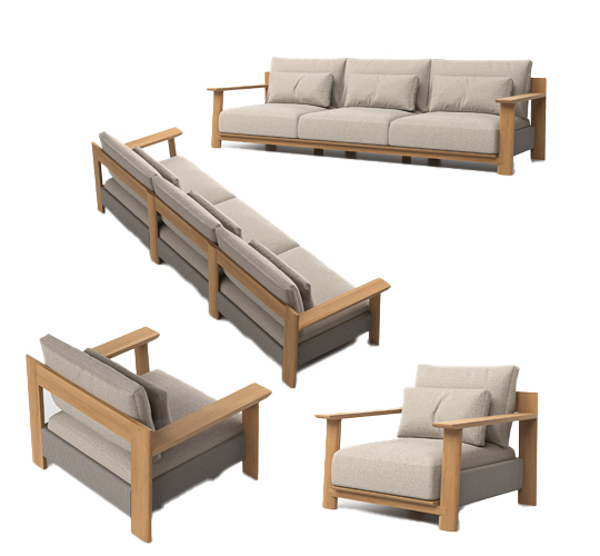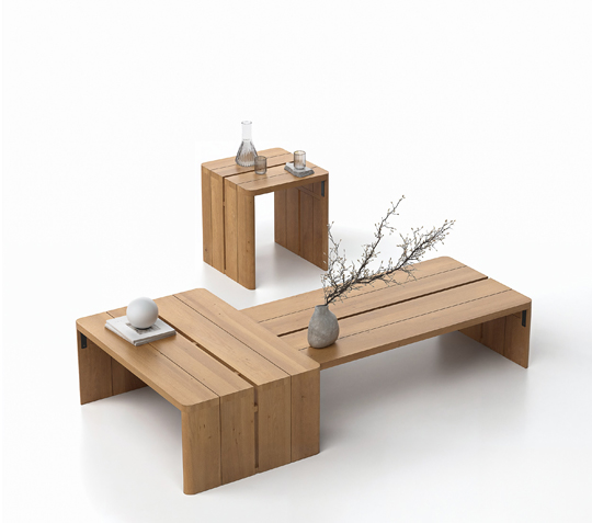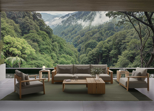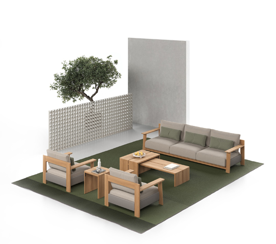 The winter garden features pieces from the Olma collection by La Mamba Studio, where teak structures and rope detailing reinterpret the fluid silhouette of a rowing oar. Nearby, the Serra collection by Kar Duran & Miguel López introduces a more graphic contrast—woven seating paired with slender metal legs—seen in a daybed and side table that anchor a secluded relaxation zone.