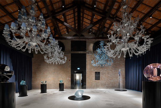 Set in the historic Sala dell’Acqua, a 1920s architectural gem crowned by four Barovier&Toso chandeliers and overlooking Murano’s Rio dei Vetrai, the exhibition space deepens the dialogue between past and present. A dedicated bar area invites guests into conversation, reinforcing the gallery’s cultural mission.