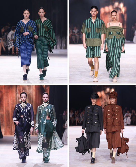 Rooted in utilitarian codes, the collection showcased relaxed yet structured silhouettes: cocooning jackets, fluid jumpsuits, generous trousers, and layered tunics that blurred traditional gender distinctions. Function-driven design found harmony with refined craftsmanship, where twisted constructions, subtle embroidery, and whisper-soft beadwork became Biyan’s understated signature.
