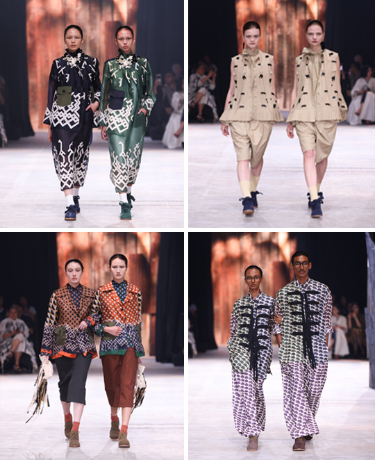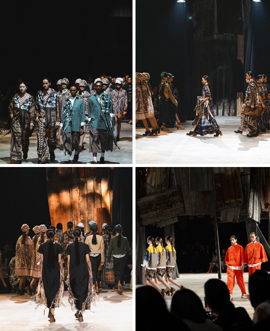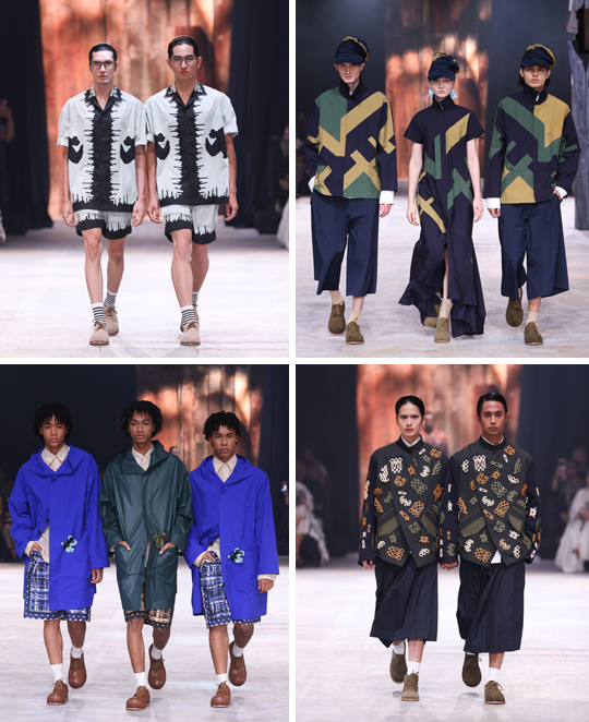 Materials such as denim, linen, cotton, nylon, and silk further reinforced the dialogue between strength and softness. The color story unfolded with poetic restraint. Industrial neutrals—dusty browns, greys, and muted earth tones—gradually gave way to blues, greens, reds, and denims, symbolizing transformation and renewal. Motifs of endangered fauna, flora, geometric forms, and painterly polkadots served as visual reminders of nature’s fragility and humanity’s responsibility.
