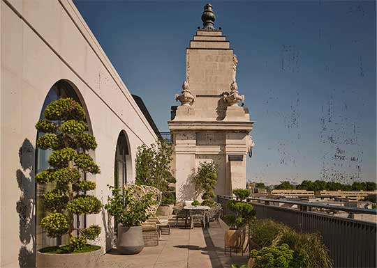 The principal suite is a serene retreat, featuring a bespoke Kasia leather headboard, integrated brass reading lights, and a generous walk-in dressing room with custom Backstage wardrobes. Each bedroom harmonizes period features with contemporary finishes and curated artwork. The study offers a sophisticated workspace, complete with black oak Biblia bookcases and a Calacatta marble Pathos desk. Outside, a 952 sq. ft. terrace, furnished with B&B Italia Outdoor pieces, offers space for quiet reflection or entertaining.