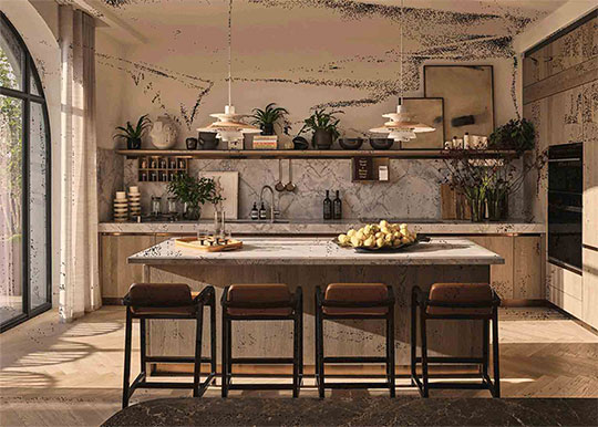 The interiors exemplify Maxalto’s signature approach: elegant yet practical. Custom boiserie panelling frames the entrance and living area, where a Corteccia stone fireplace complements a Lilum sofa, Xilos coffee table, and Intoto dining table beneath Flos Skygarden pendants. Warm leather Fulgens bar stools, a sculptural Arclinea kitchen with Bianca Eclipsia quartzite, and tactile natural materials strike the perfect balance between heritage and modernity.