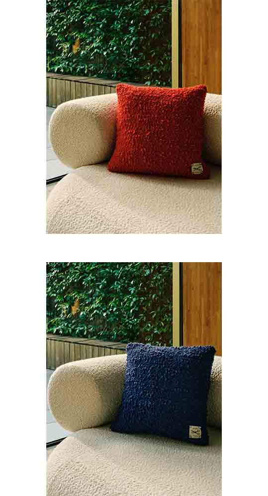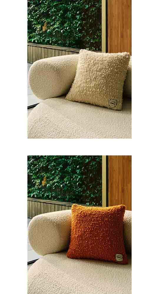 The Bobble cushions bring a playful counterpoint. With their bouclé surfaces and colour palette spanning from earthy neutrals to vibrant orange, ochre, and blue, they instantly lift a space—small, joyful accents that invite comfort and layering.