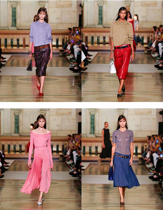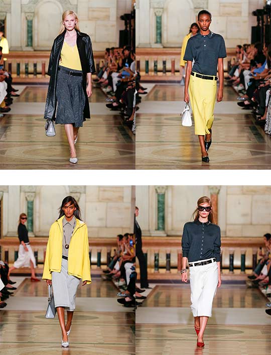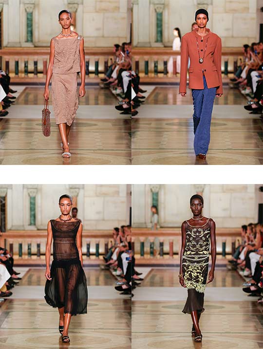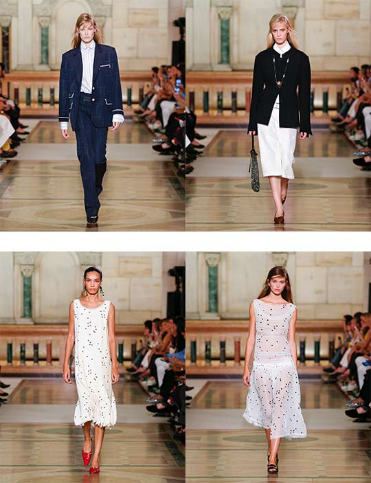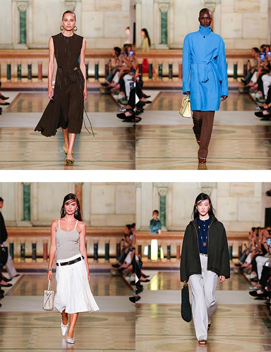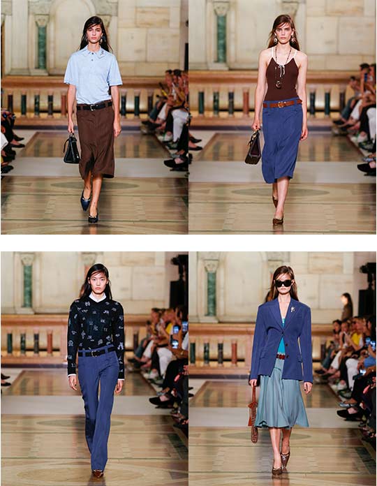 For Spring/Summer 2026, Tory Burch celebrates the many sides of women—strong yet feminine, precise yet playful. The collection mixes classic American sportswear, like polo shirts, trenches, and striped tops, with romantic touches such as drop-waist dresses and delicate florals. Tailoring shifts lower with hip-slung trousers and leather skirts, while jackets feature hidden zippers to subtly change their shape. A piped blazer pays tribute to Tory’s father, Buddy.