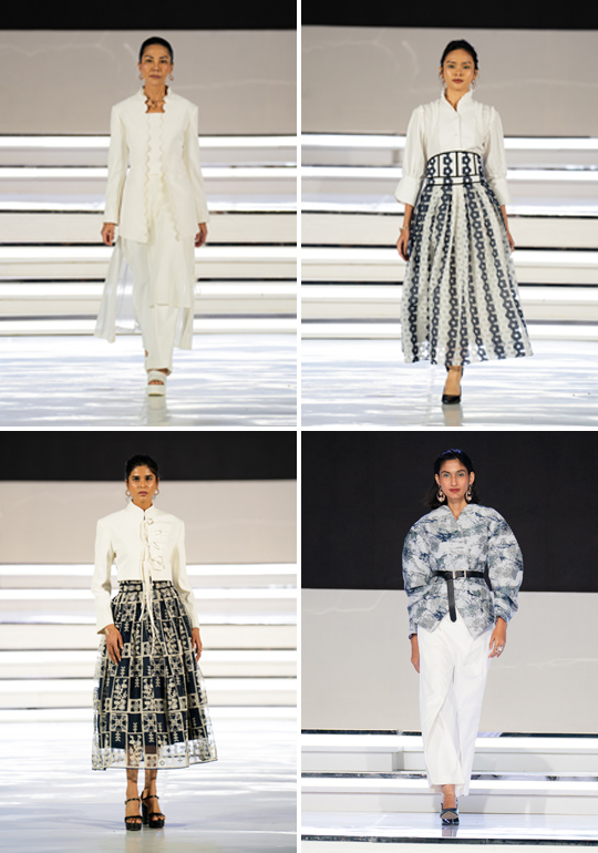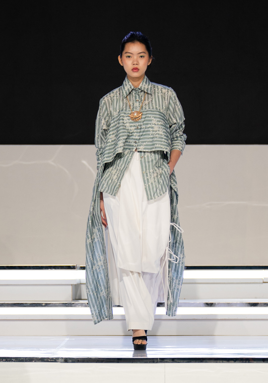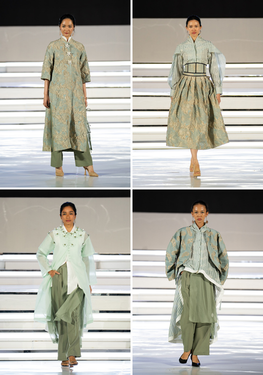 Koleksi menonjolkan konstruksi yang bersih, permainan layering yang modular, serta proporsi yang memanjang, sehingga referensi tradisional tampil dengan kejernihan arsitektural yang modern.