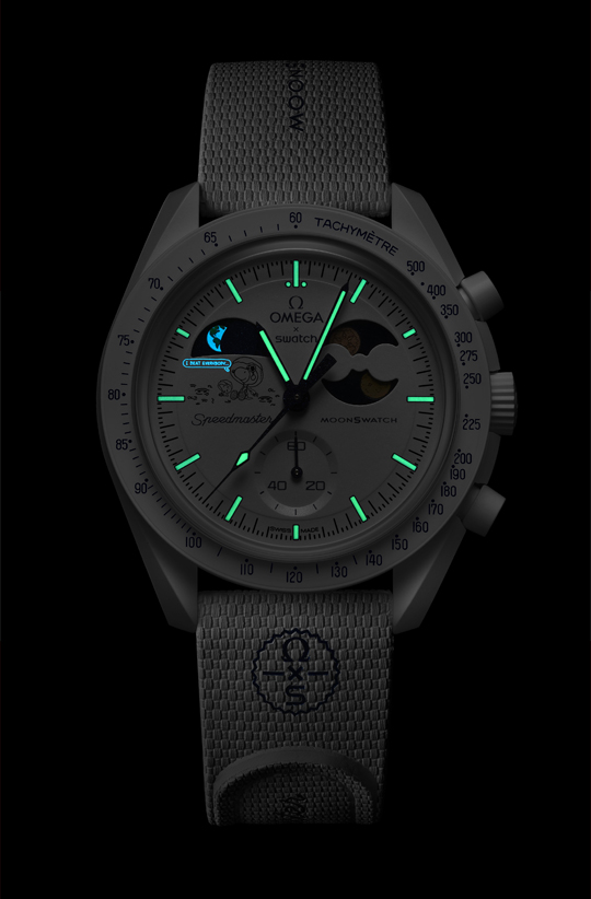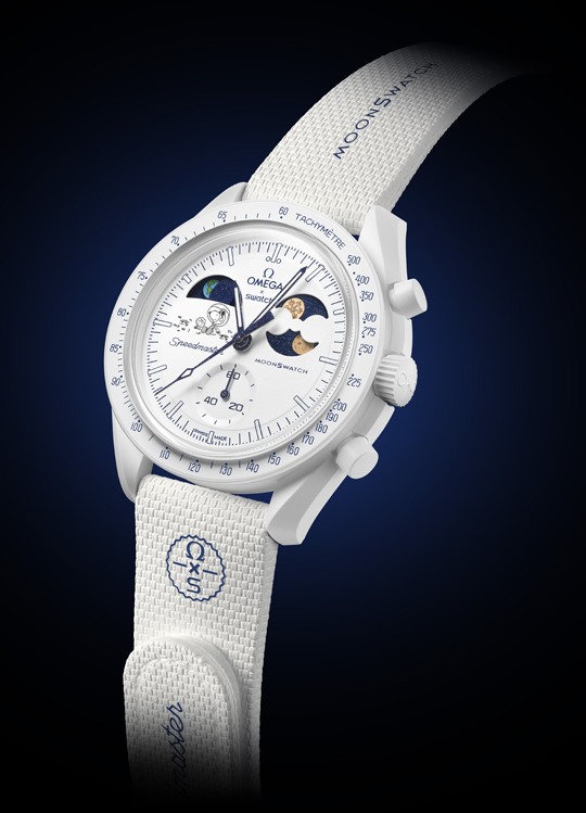 Wrapped in a calm winter-white hue, this edition captures the quiet beauty of snow-covered landscapes. At its heart lies Swatch’s Earthphase innovation, paired with a moon phase indicator illuminated with OMEGA’s Moonshine™ Gold, bringing a soft, warm glow to the cool palette. At 9 o’clock, Snoopy returns with a playful snowy twist — a small detail that instantly warms the design with a sense of nostalgia and joy.