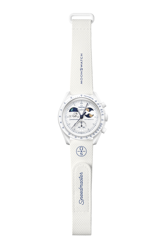 Crafted from Swatch’s patented Bioceramic, the watch retains the signature markers of the Speedmaster Moonwatch: the asymmetrical case, recessed subdials, and the iconic tachymeter scale with the dot over ninety. The OMEGA x Swatch logos are proudly placed on the dial and crown, while the mission statement engraved on the caseback anchors the design in its storytelling roots. Completing the piece, an Earth-inspired battery cover and a white VELCRO® rubber strap add a final touch of character and ease.