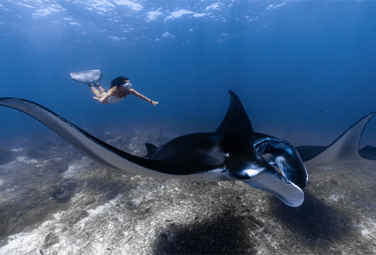Guests journey across emerald islands aboard the resort’s private boats, moving at an unhurried pace toward protected manta sites. Beneath the surface, coral gardens reveal themselves slowly, while manta rays glide in wide, effortless circles. There is no sense of spectacle here—only quiet observation and a deep connection to the rhythm of the sea.