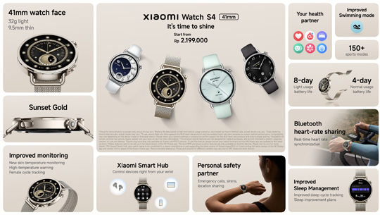 Didukung daya tahan baterai hingga delapan hari, Xiaomi Watch S4 41mm hadir dalam warna Black dan Mint Green dengan harga mulai Rp2.199.000, Leather White mulai Rp2.499.000, serta edisi paling premium Milanese Sunset Gold dengan crown lab-grown diamond seharga Rp3.099.000.