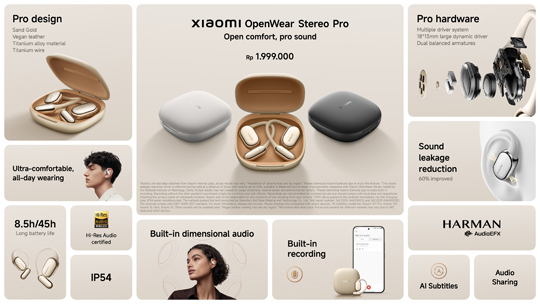 “Salah satu keluhan terbesar pengguna earbuds adalah soal kebocoran suara. Karena itu, Xiaomi OpenWear Stereo Pro kami lengkapi dengan algoritma audio dan driver hasil pengembangan internal untuk mengurangi kebocoran, sekaligus memberikan kualitas suara yang jernih di berbagai situasi,” ujar Jeksen, Product Manager Xiaomi Indonesia.