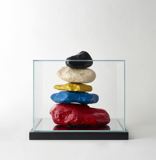 Yong Nam Kim, Colors of Memories 2, 2024, pietre rivestite di Ottchil in teca di vetro, 61,5×61,5×41,8H cm