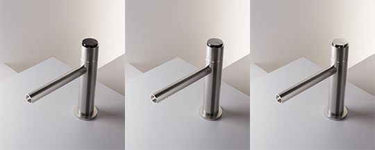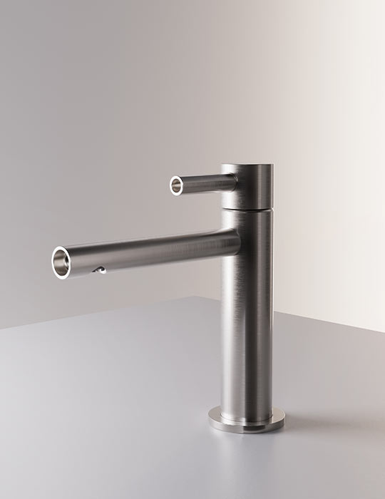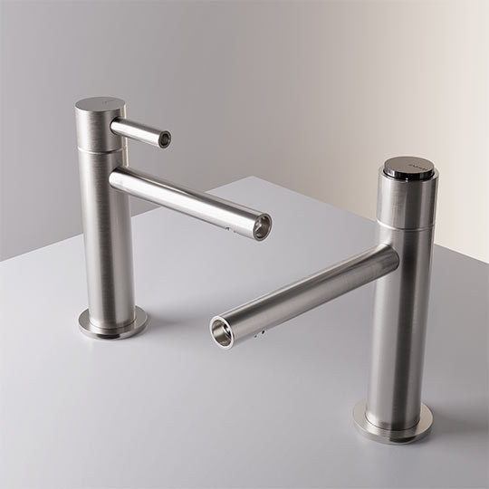Two handle options complete the system. In the lever version, a tubular control element integrates seamlessly into the mixer body, with a circular opening that subtly echoes the geometry of the spout. The cylindrical handle offers a more compact expression, featuring a circular insert that defines the joint with precision. The insert can match the faucet finish or be customized for a refined contrast, adding depth without disrupting the collection’s formal coherence.